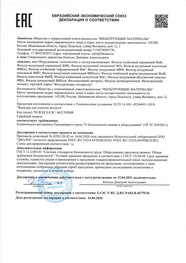 СертификатыГОСТ Р ЕН 779-2014 (2025) ГОСТ Р ЕН 779-2014 (2024) лист 1 ГОСТ Р ЕН 779-2014 (2024) лист 2 Декларация о соответствии ТР ТС (2026) ГОСТ Р ЕН 1822-1-2010 (2024) лист 1 ГОСТ Р ЕН 1822-1-2010 (2024) лист 2